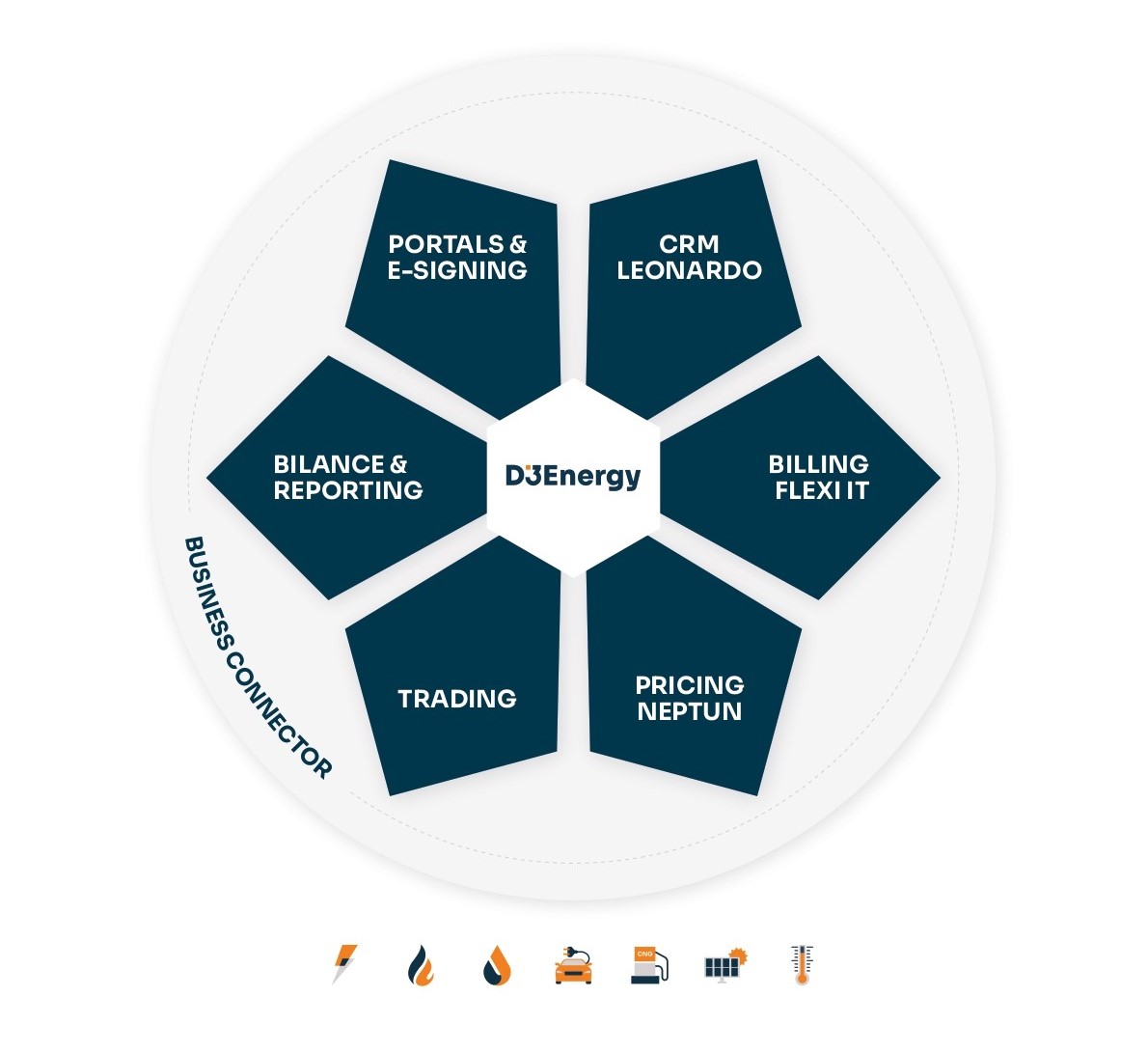 D3Energy is a comprehensive solution for energy companies that operate as traders and distributors (including LDS), as well as suppliers to end customers in commodity sectors such as electricity, natural gas, heat, water, e-mobility, and CNG.